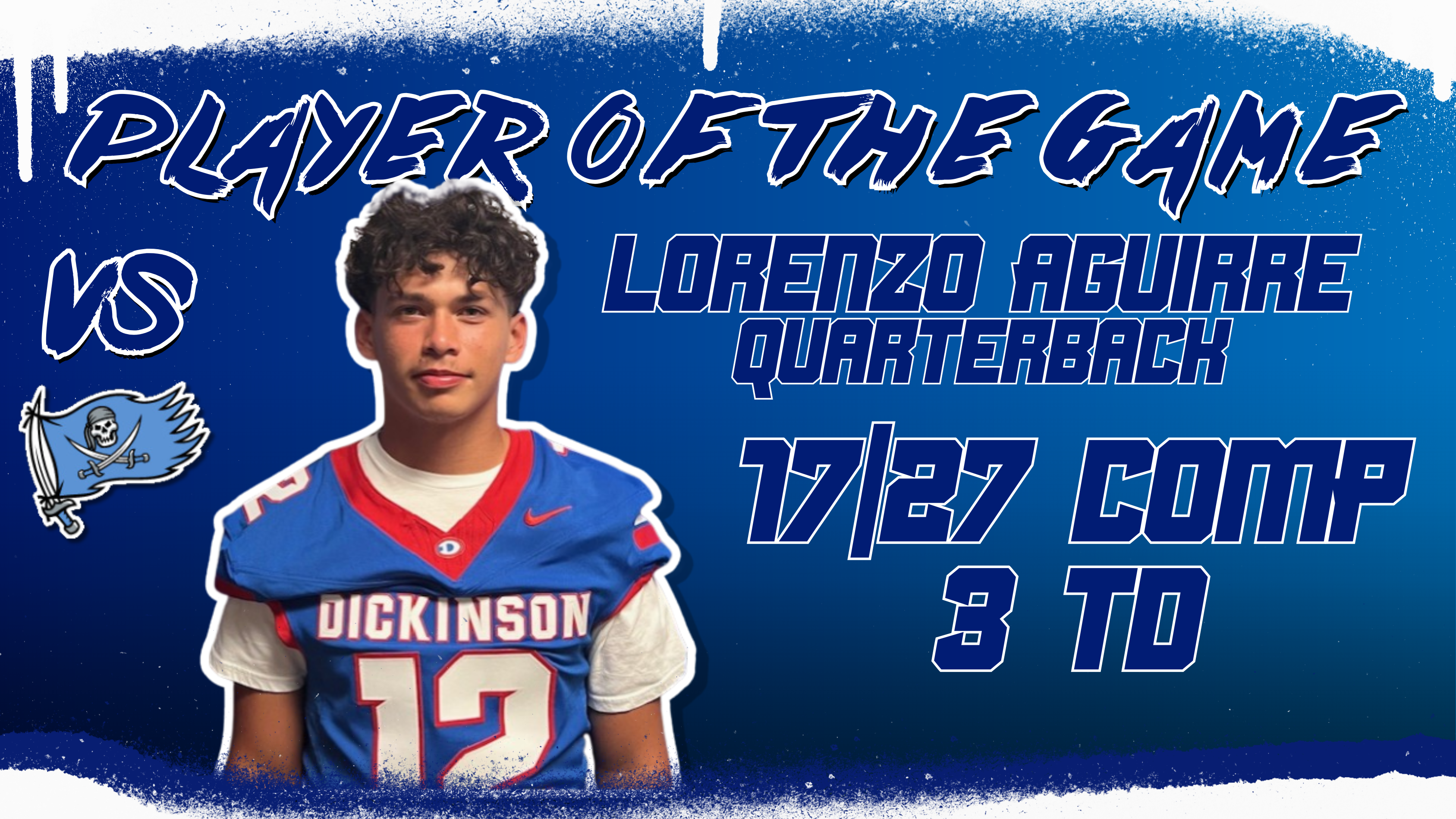 As Dickinson Gator Football battles through district opponents, we will spotlight and recognize one of our standout athletes whose performance, effort, and leadership made a major impact on the field. Player of the Game honors not only highlight big plays and key stats, but also celebrate the hard work and dedication that drive Gator Football forward.