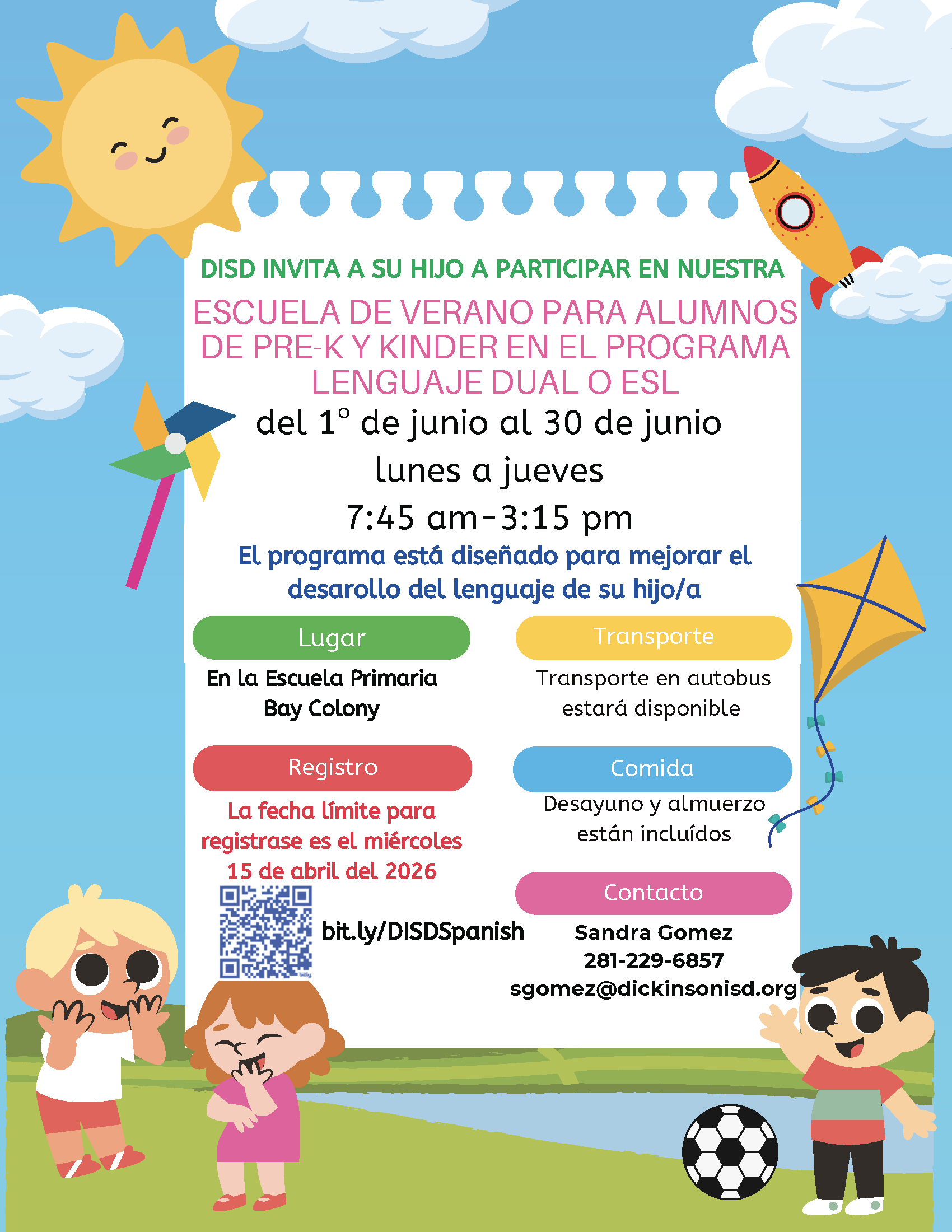 Dickinson ISD is inviting families to register for its Pre-K and Kinder Dual Language and ESL Summer School program, which will take place June 1 through June 30, 2026, at Bay Colony Elementary School.