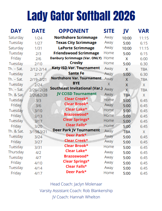 The Lady Gator Softball teams are compiled of female student-athletes in grades 9-12 who compete on the JV and Varsity level. Our season begins in mid-January and district play concludes at the end of April. Games and tournaments take place on Tuesday's, Friday's, and some on weekends. The softball team practices every day after school at the DHS Softball field. The Lady Gator's are led by Head Coach Jaclyn Molenaar and Assisted by Coach Rob Blankenship and Hannah Whelton.