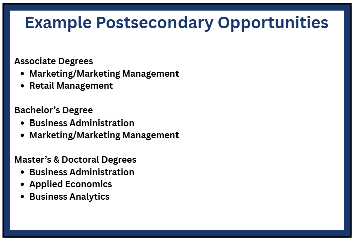 The Business, Marketing, and Finance career cluster focuses on careers in planning, organizing, directing, and evaluating business functions essential to efficient and productive business operations. This career cluster includes occupations ranging from business owner and entrepreneur to accountant, retail manager, and market analyst.