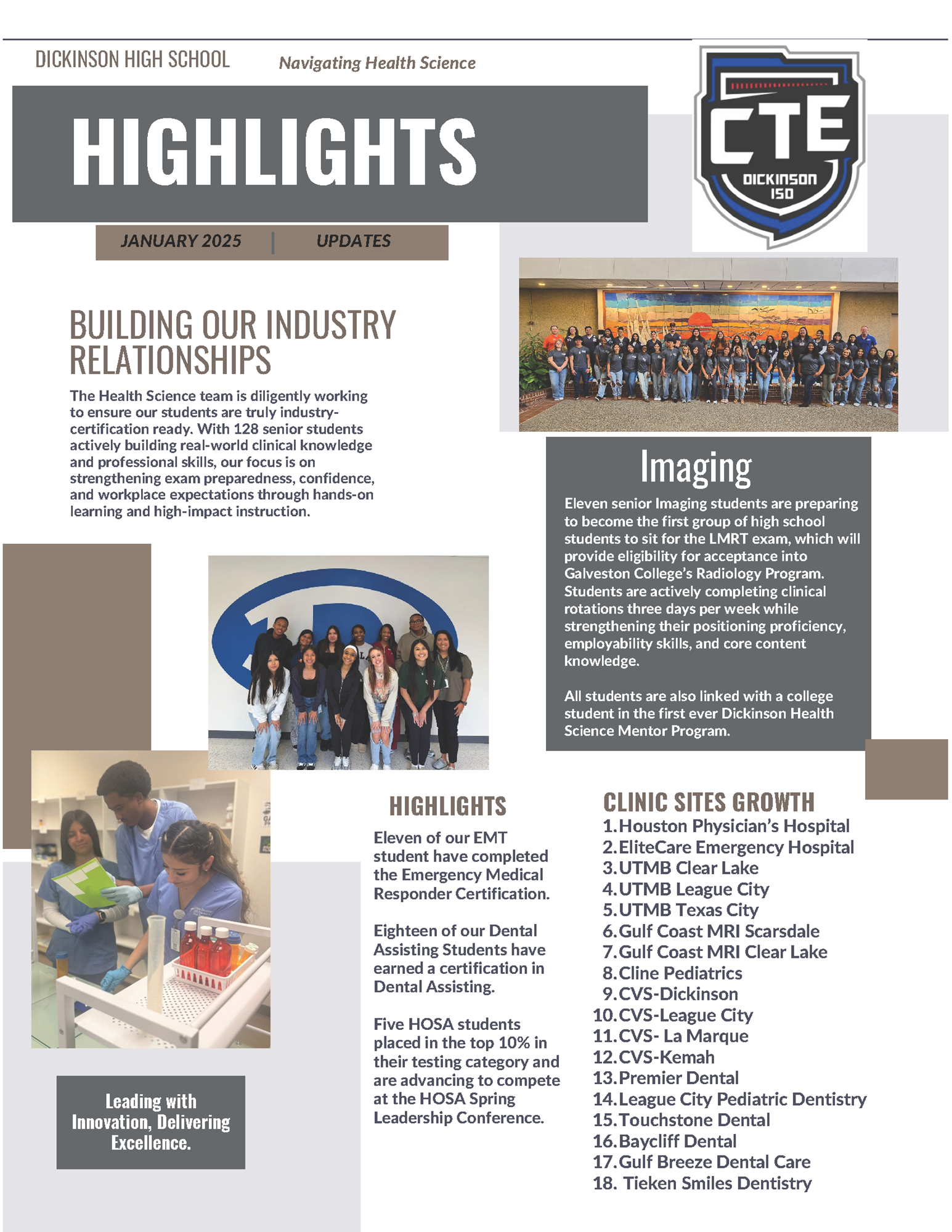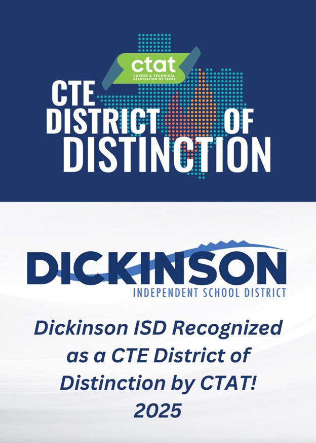 Dickinson Independent School District has been named a CTE District of Distinction by the Career and Technical Association of Texas (CTAT). This prestigious honor recognizes districts across the state that demonstrate exemplary leadership, innovation, and dedication to student success through outstanding Career and Technical Education (CTE) programs.