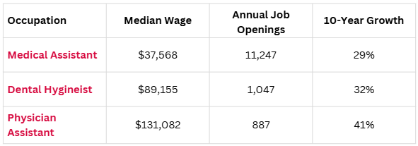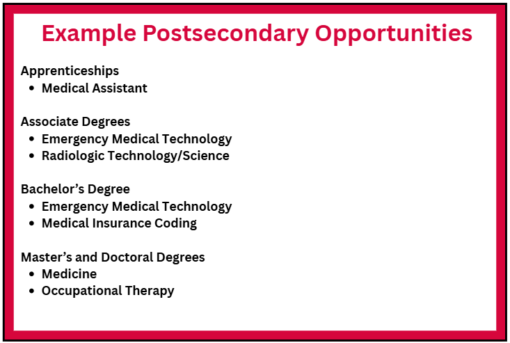 The Health Science career cluster focuses on planning, managing, and providing therapeutic services, diagnostics services, health informatics, support services, and biotechnology research and development. This career cluster includes occupations ranging from medical assistant, registered nurse, and physical therapist to forensic science technician and athletic trainer.