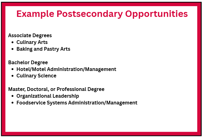 The Culinary Arts program of study focuses on occupational and educational opportunities associated with the planning, directing, or coordinating activities of a food and beverage organization or department. This program of study includes opportunities involved in directing and participating in the preparation of food.