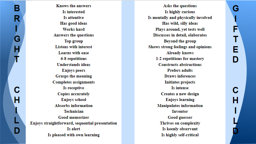 Still Not Sure if you should refer your student?We have provided the resource below to help parents decide whether or not to refer their student. This chart can help you see the difference between a bright child and a gifted child. While bright children often excel by working hard and learning with ease, gifted children may show advanced curiosity, creativity, and problem-solving skills beyond typical expectations. If you notice your child consistently showing the characteristics in the ‘Gifted Child’ column, you may want to consider referring them for Gifted and Talented (GT) identification.